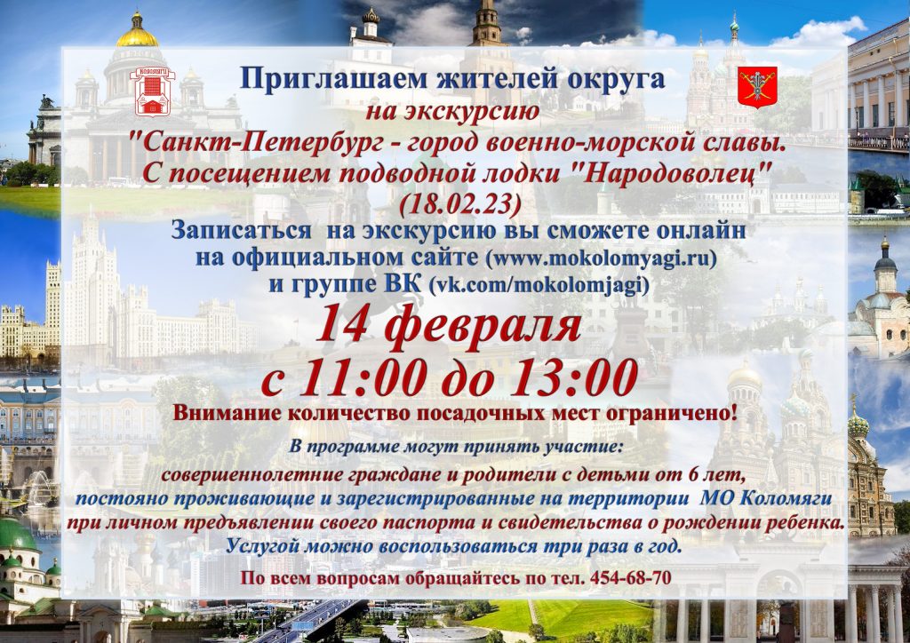 Уважаемые жители МО Коломяги! Приглашаем посетить бесплатную автобусную экскурсию «Санкт-Петербург – город военно-морской славы», с посещением подводной лодки «Народоволец» Онлайн запись будет открыта 14.02. в 11:00 Для записи на экскурсию, Вам необходимо пройти по ссылке и заполнить форму заявки: https://forms.gle/wQwcp5NJtjKhS4U8A Дата экскурсии 18.02. Подача автобуса 09:00 Отправление 09:15 Возвращение 13:15 Сбор участников: ул. Вербная д.16 …