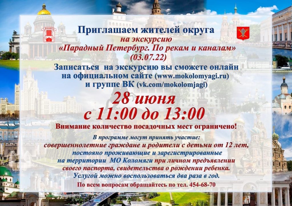 Записаться на экскурсии вы можете 28.06. с 11:00 ОНЛАЙН (ниже по ссылкам) 1. Экскурсия «Путешествие по Оредежскому краю» для совершеннолетних граждан, постоянно зарегистрированных на территории МО Коломяги: запись по ссылке — https://forms.gle/RpNJT5N1oEH3oM2t7 Дата экскурсии 02.07. Подача автобуса 08:00 Отправление 08:15 Возвращение 16:00 Сбор участников: ул. Вербная д.16 В программе экскурсии: Экскурсия по парку Рождествено в селе …