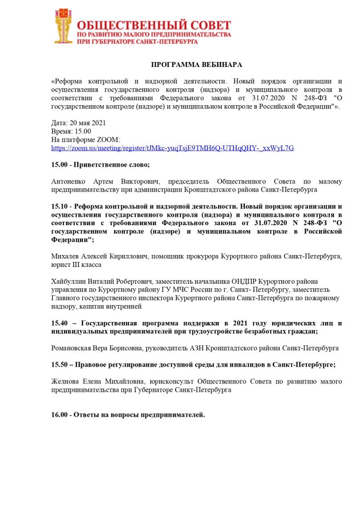 Приглашает принять участие в ВЕБИНАРЕ по теме: Реформа контрольной и надзорной деятельности. Новый порядок организации и осуществления государственного контроля (надзора) и муниципального контроля в соответствии с требованиями Федерального закона от 31.07.2020 №248-ФЗ «О государственном контроле (надзоре) и муниципальном контроле в Российской Федерации». Дата: 20 мая 2021 Время: 15.00 На платформе ZOOM: https://zoom.us/meeting/register/tJMkc-yuqTsjE9TMH6Q-UTHqQHY-_xxWyL7G