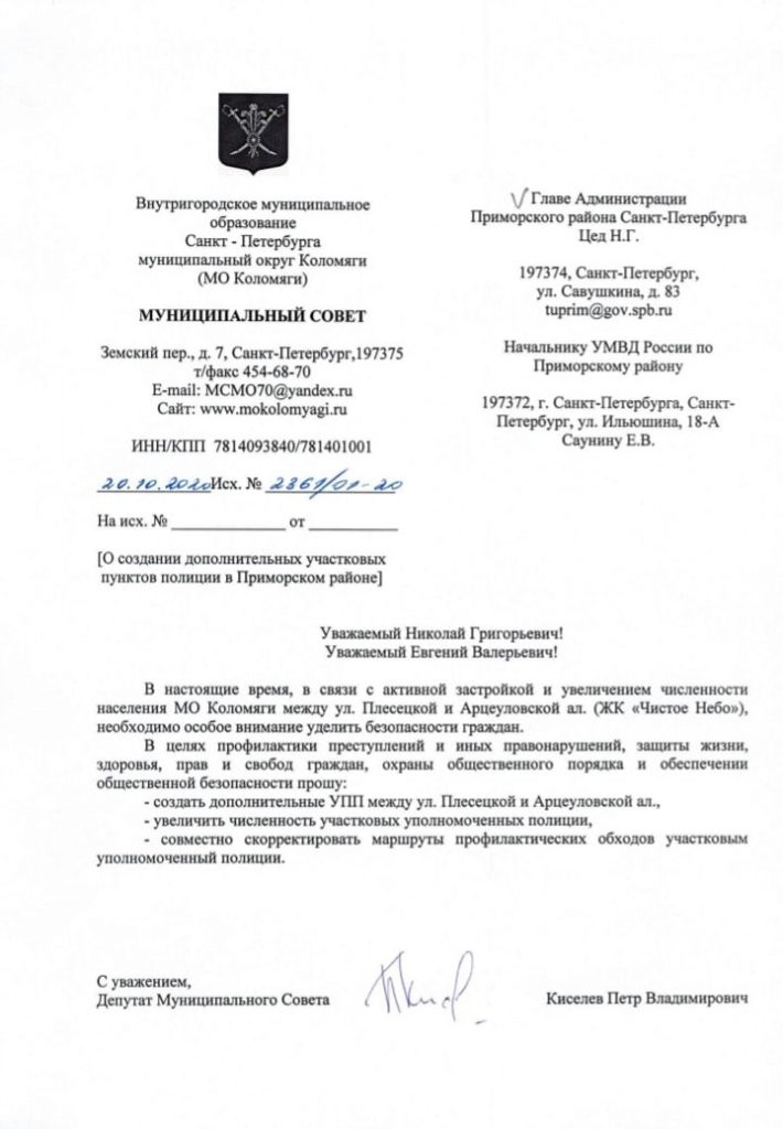 9 ноября 2020 года начальник УМВД России по Приморскому району г. СПб (далее – УМВД) полковник полиции Саунин Е.В. и председатель Общественного совета при УМВД Угаров И.Н. в преддверии Дня сотрудника ОВД РФ высадили кустарники на Аллее Памяти. В далеком 2001 году начальником УВД по Приморскому району г. СПб полковником милиции Крецу В.А. на пр. …