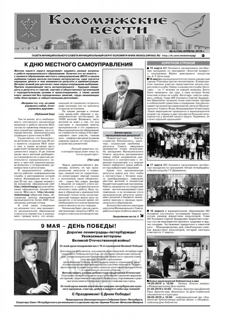 21 апреля – День местного самоуправления Дорогие петербуржцы! От имени депутатов Законодательного Собрания Санкт-Петербурга поздравляю вас с Днем местного самоуправления! Муниципальная власть всегда была и остается самой близкой к гражданам. Представители муниципалитетов решают ежедневные насущные вопросы жителей, мгновенно реагируют на проблемы и запросы людей, обеспечивают развитие комфортной городской среды. Эффективность работы власти на местах во …