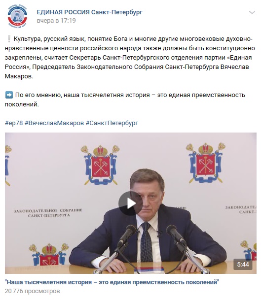 Культура, русский язык, понятие Бога и многие другие многовековые духовно-нравственные ценности российского народа также должны быть конституционно закреплены, считает Секретарь Санкт-Петербургского отделения партии «Единая Россия», Председатель Законодательного Собрания Санкт-Петербурга Вячеслав Макаров.